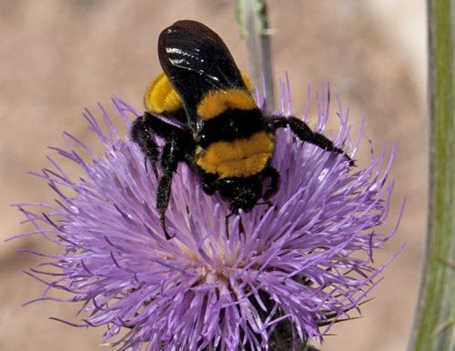 Above, this fine native bumble bee was caught pillaging a thistle blossom in a small slot side-canyon of Lower Hot Springs Canyon on April 25, 2011. The morning air was still cool (for which reason the bee was slow-moving enough to be still-captured at fairly close range) and a thistle plant was actually blooming here after a very poor spring rainy season, because the sandy soil of the slot canyon at this point had retained more moisture than the floodplains below.