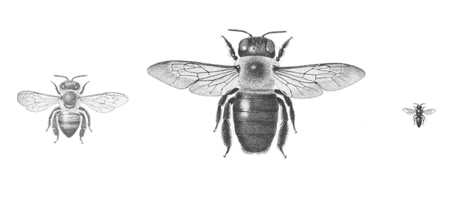 Below, roughly at their true relative sizes, at left: European Honey Bee; center: Carpenter Bee -- 30-40 mm long; right: silk-making bee -- 4 mm long. This should provide a sense of the range of sizes attained by bees of various species around the world. The world's smallest known bee -- Perdita minima, only 2 mm long, is found in the vicinity of Tucson.