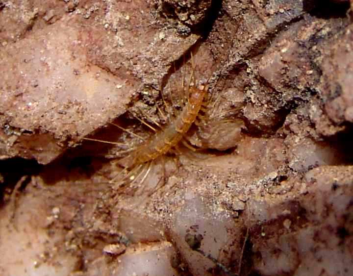 In the early springtime, young ones can be found from time to time on rocks that have been overturned. This delicate Scutigera sp. below, seen in March 2005 in Hot Springs Canyon, is no more than an inch in length. These also move quickly, but stop more often to hide:
