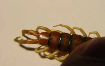In our area, The Giant Desert Centipede (Scolopendra heros) reaches a length of almost 8" (40 cm), with 20 pairs of legs or more. They are brightly colored in brownish yellows, with red, orange, or green, with a dark bluish head,. They are mainly nocturnal predators, who burrow under soil, litter, or rocks, and move out very rapidly to kill prey as diverse as small arthropods, lizards, and even mice. To humans, the Centipede's bites are roughly equivalent to a wasp's sting in effect, with swelling and occasional slow healing of the wound.