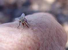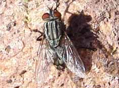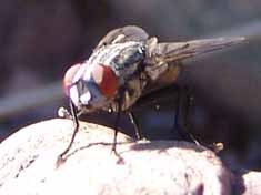 House Flies are found worldwide. Most lay their eggs in rotting or at least damp matter, and the larvae can pupate very quickly. Here, below, is a Saguaro-Juniper area House Fly, in Lower Hot Springs Canyon June 01 2004. On the left probing the sweat at the base of a human thumb, the other two on sunny rocks. Click on each image to enlarge it.