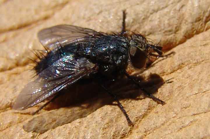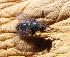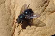 Blowflies are found worldwide, and land upon flowers, vegetation, carcasses, and human food. They are "typically stout and may be metallic green or blue, shiny black, or dull" (McGavin, op.cit., p. 143). They are also distinct in having stout bristles on both thorax and abdomen, as you can see on these closer views, images from April 2005 (below). Click on each image to enlarge it.