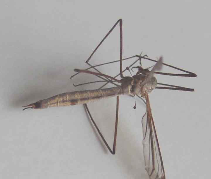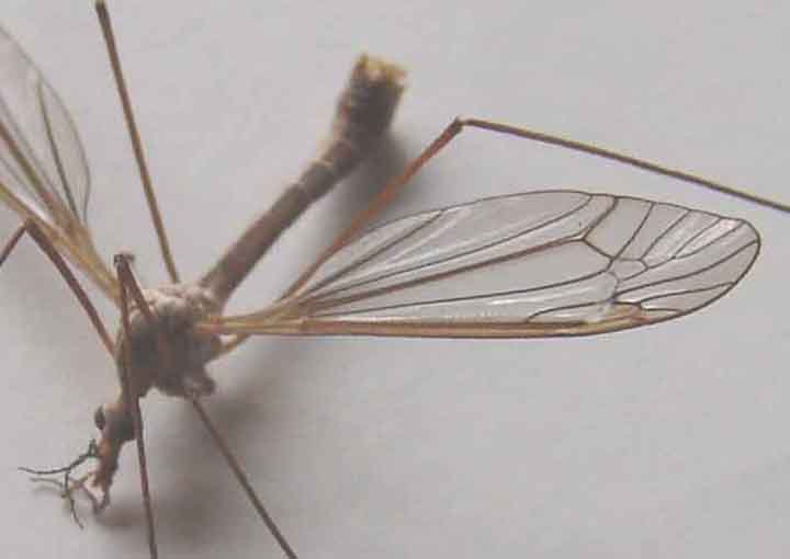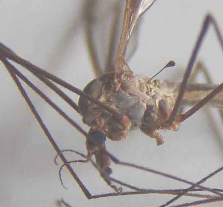 These flies have characteristically very long and fragile legs, which readily break off if the insect is caught (as the male below left shows -- one of its legs is missing). The front of the head is very elongated, and the thorax swollen. The abdomen is long and slender, ending in a blunt tip in males (shown below). The wings are long also. The images below center and right show more details (click on each of these images to enlarge it), the right-hand image showing both the rather short antennae and the distinctive feature of the Diptera,or "Two-wings": "the hindwings [characteristic of other flying insects] are reduced to small, club-shaped balancing organs called halteres." (McGavin, cited on Arthropod page, p. 136) The enlargement at right shows a haltere clearly.