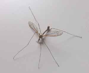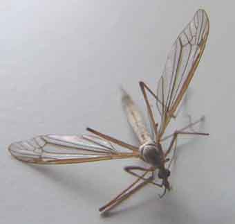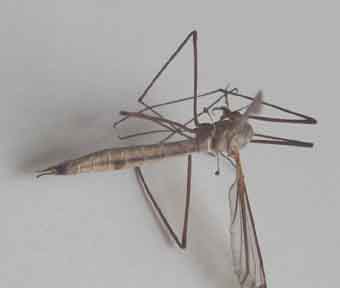 Crane Flies exist in some 15,000 species, and are found worldwide, most often in damp, shaded woodland. (Some larvae are aquatic predators.) To uninformed observers, they may be misidentified as huge mosquitoes (also members of the Order Diptera). These hapless captives/victims above were found flying to light in the grassy mesquite bosque near Teran Wash in early April 2005. Many species of this family are short-lived, and the adults -- who are obviously large and (unlike mosquitoes) fly rather clumsily -- are readily taken by birds. They usually lay their eggs in soil and the larvae eat various kinds of plant material.