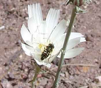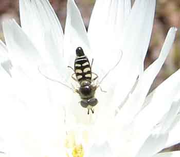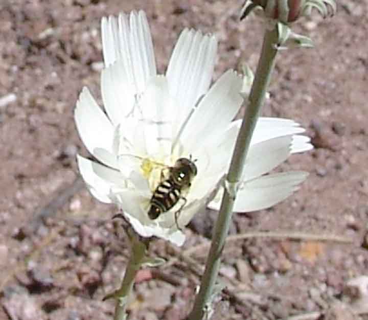 Hover Flies are also worldwide in distribution. They are distinctive in their behavior: they are also called Flower Flies because they "hover and dart between flowers" (McGavin, cited on main Arthropod page, p. 153). Many of them look very wasp-like in shape, and many have yellow abdomen bands like wasps (though some are more bee-like). Here are views from a pair of many of this species seen feeding on the numerous Desert Chicory flowers on our lands in April 2005: (Click on each image to enlarge it.)