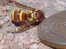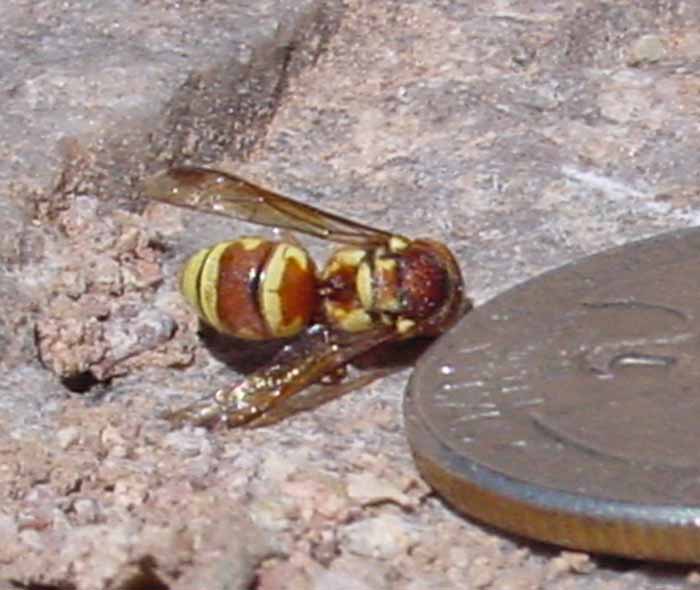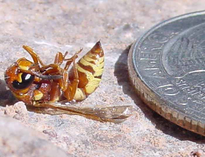 This was a very tiny yellow wasp (size is shown in relation to a quarter), found dead in Lower Hot Springs Canyon in October of 2002: (Click on each image to enlarge it.)