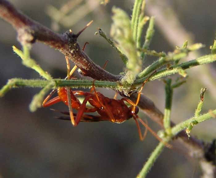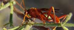 Below left: this very tiny red wasp -- it looks like an Ichneumon -- was stalking the limbs of a Whitethorn Acacia tree which had been attacked by some kind of cocoon-spinning insect in May 2004; (Click on this image to enlarge it.)
