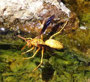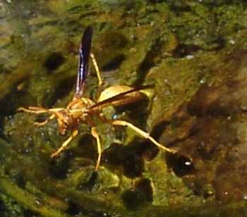 Below, views of our most common wasp, which is strongly attracted to standing water in midsummer (late May 2004, temperature over 100 degrees F), and continues active into late fall: (Click on each image to enlarge it.)