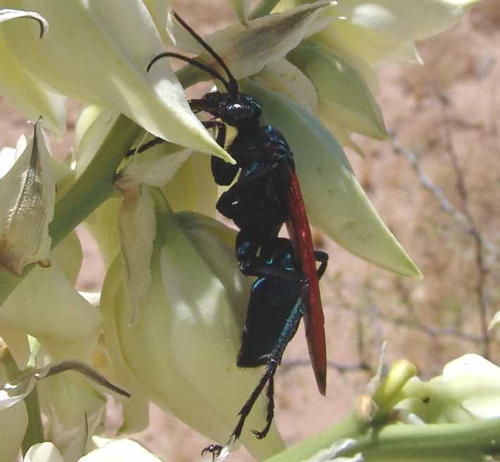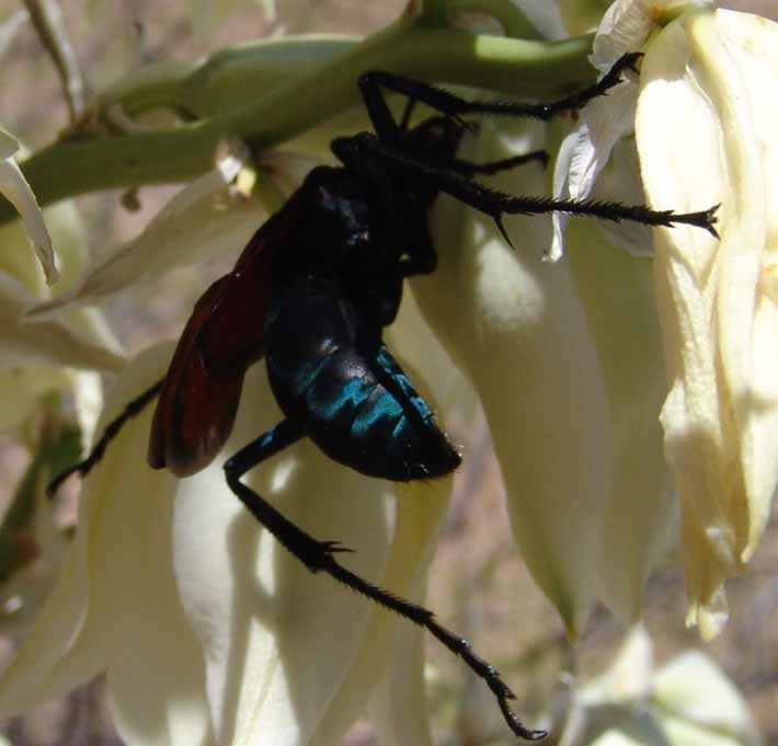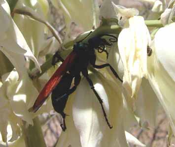 Below left: a clear view of the amber-to-reddish-orange-colored membranous wings (those of some species are black), with the dark, smoky border at the back edges; below right: the antennae of the Tarantula Hawk curl up in characteristic fashion (which often happens also after death; here perhaps to negotiate the narrow quarters of the Yucca elata flower clusters on which it is feeding); what looks like a protruding stinger at lower-left rear of the animal is actually the left rear leg.