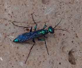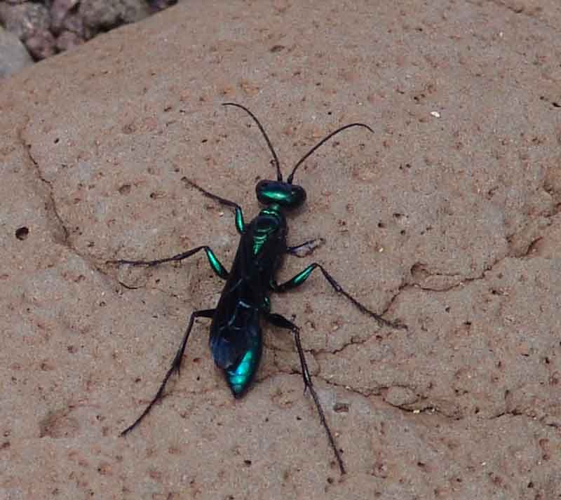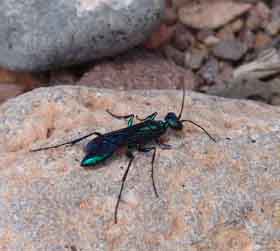 Digger Wasps, members of the family Sphecidae, number some 8,000 species worldwide. The genus Chlorion is characterized by its metallic-green body and head. These are solitary species which parasitize crickets, dragging each one to a burrow in which it deposits a single egg. This one below, considerably smaller (< 2 inches long) than the Tarantula Hawk shown above, was however very similar in possessing aposematic coloring. It was photographed in August 2006 in lower Hot Springs Canyon following the unusually heavy rains of that month, when insects began to reappear in our area after a long period of scarcity.