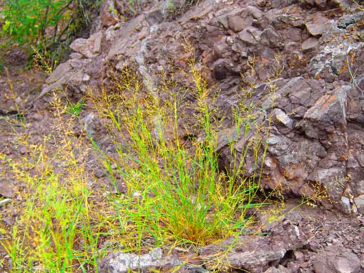 Introduced from its native South Africa in the 1930s as a means of restoring depleted rangelands, this warm-season perennial grass prefers sandy soils and pioneers disturbed sites. It has competitive advantage over native grasses both because of its early production of abundant seeds and its positive response to fire and grazing. It is also easy to confuse with native grasses.