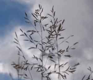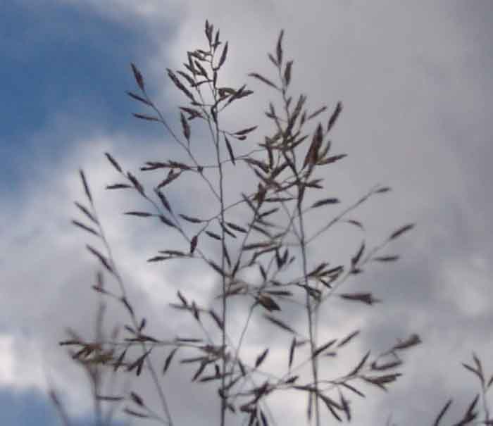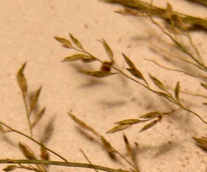 The structure of the inflorescence may be confused with other Lovegrass (Eragrostis) species, in particular Plains Lovegrass (Eragrostis intermedia). The distinction is that in the Plains species, the length of the pedicel -- the stalk to which each seed is attached -- is much longer than the seed itself, while in Lehmann's lovegrass, the pedicel is generally shorter than the length of the seed. This is evident in the images of Lehmann's Lovegrass shown below, taken from the same stand of plants: (Click on each image to enlarge it.)
