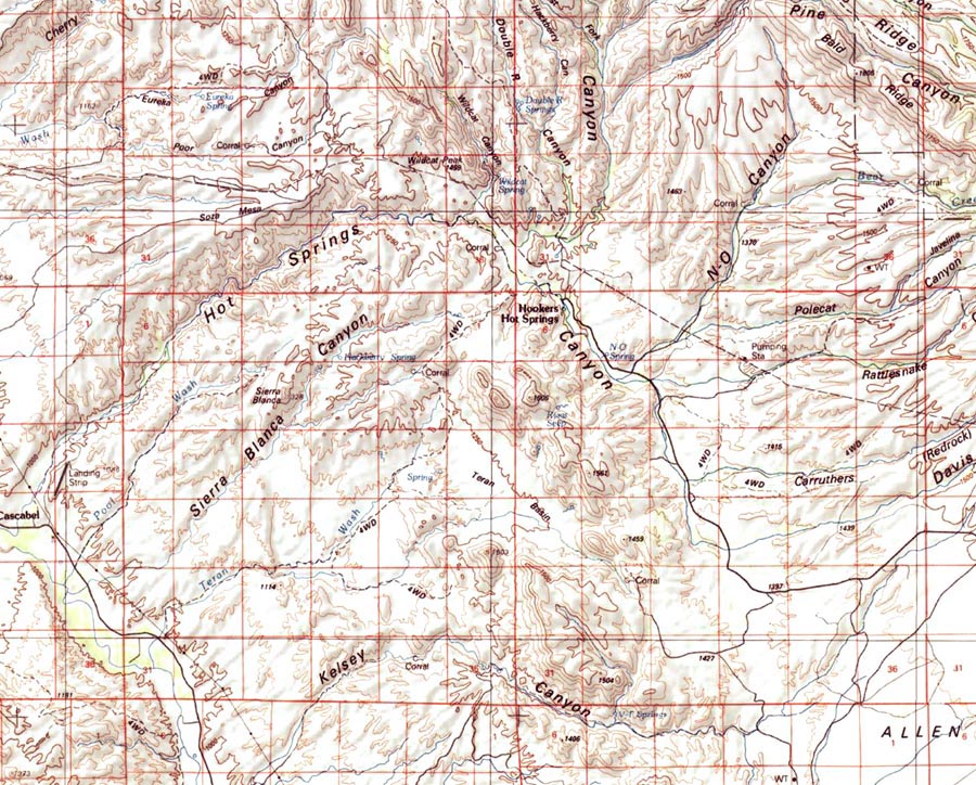 The Allen Flat at lower right above lies outside the Hot Springs Canyon drainage, as do the washes running out of Soza Mesa into Cherry Canyon at far upper-left. Allen Flat drains through Kelsey Canyon, as shown here, and through the Tres Alamos Wash which is mostly out of view.