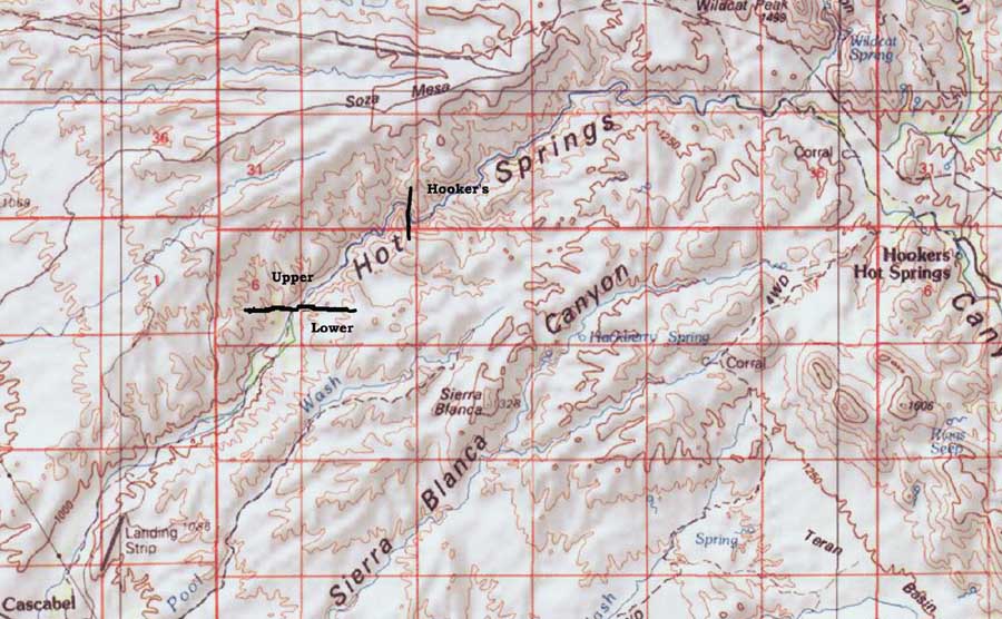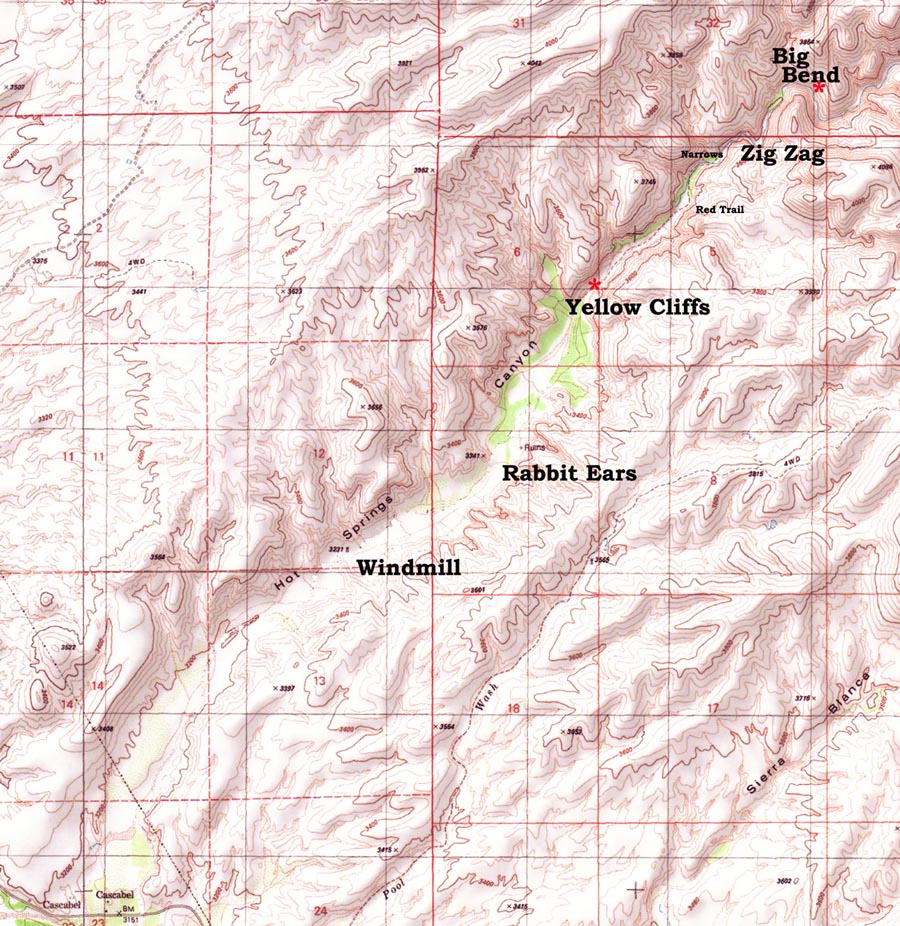 As shown in the map below, The Lower Hot Springs Canyon portion runs from Cascabel past the Windmill and Rabbit Ears Saguaro Hill To the Yellow Cliffs as shown on the map below. Upper Hot Springs Csnyon runs from the Yellow Cliffs past the Red Trail, through the Narrows to the Zig-zag Bend and on to the Big Bend, where it ends at the fish barrier site.