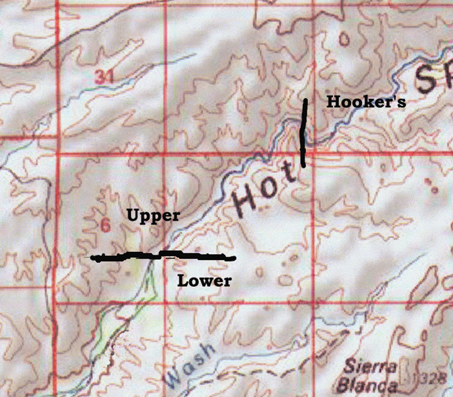 For our purposes (Saguaro Juniper Corporation), we divide Hot Springs Canyon into three sub-areas: Lower, Upper, and "Hooker's", as indicated on the map below. We are using these divisions partly for historical-environmental reasons (the division between Lower and Upper (as we have designated it for a number of years now) marks the boundary of the Yellow Cliffs (see further below), where significant vegetation changes occur, and partly because the Bureau of Reclamation is now proposing to construct a fish barrier at the northeast corner of what we call the "Big Bend". This will divide the canyon definitively at this location. Instead of reconfiguring a division among Lower, Middle, and Upper parts of the canyon (which would cause us great inconvenience in reconstituting our web pages), we choose to name this further-upstream portion after the name of the original owner of the headquarters of the Muleshoe Preserve, hence "Hooker's".