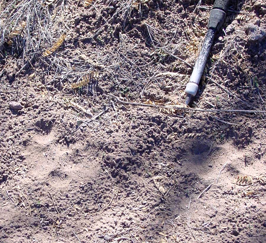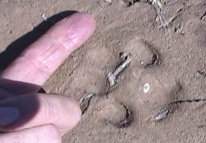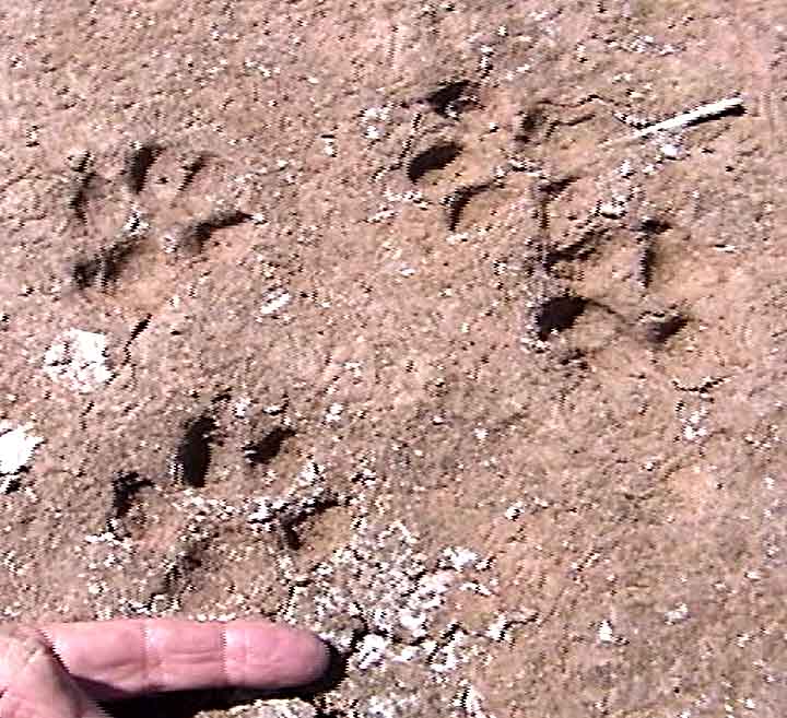 Below left & center: Mountain Lion tracks in mud (the Diversion Tank, September 2000); in both images you can see that the claws are retracted, hence do not show in the mud. This marks a sharp contrast with Canid tracks. At right, tracks in dry silt near Rabbit Ears Hill in Hot Springs Canyon, January 2003. Click on each image to enlarge.