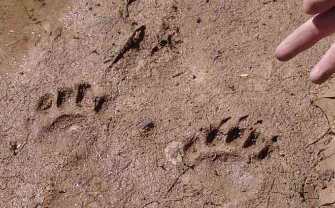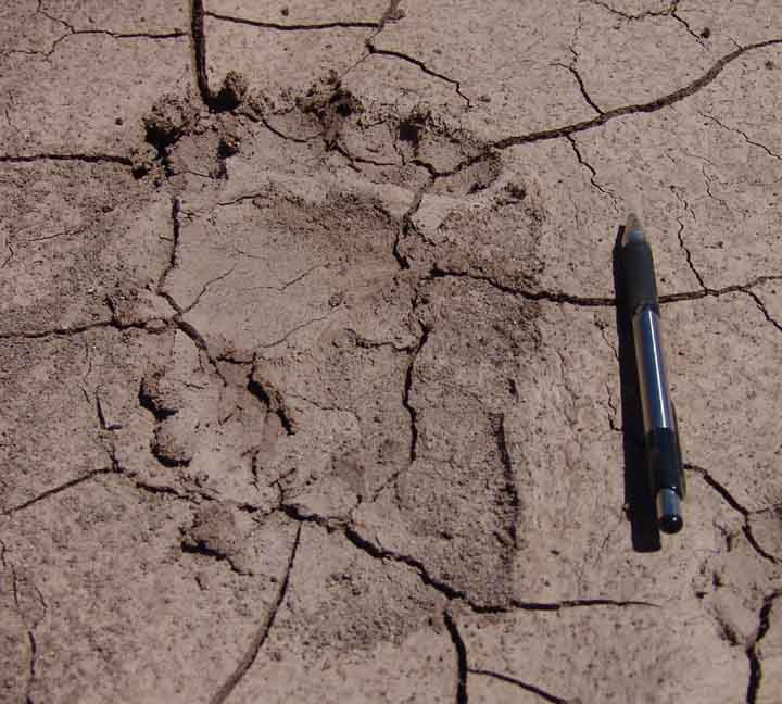 Below left: Black Bear tracks along the San Pedro River. This image shows the front paws, and you can see imprints of the claws. Below right: a hind paw track from Sierra Blanca Canyon Wash, also showing some claw marks, though this animal was slipping and sliding in fresher mud, just after a flood. Click on the images to enlarge.