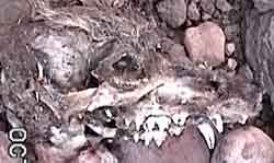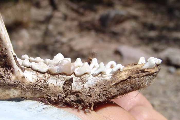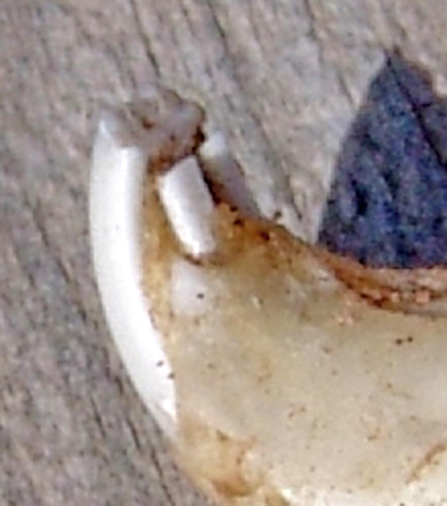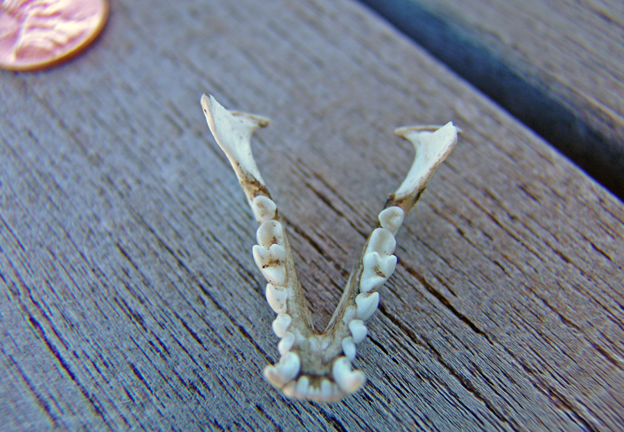 The Order of Carnivores have four or five clawed digits on each limb, the first of which is not opposable and is sometimes reduced or absent; the brain has well-developed cerebral hemispheres, and the skull is heavy, with strong facial muscles and a jaw designed only for open-and-shut movements. In these jaws are "Nipping incisors, piercing canines, and tight-gripping bladelike premolars [that] are strategically set in skulls of different length and width to take advantage of the muscular force of the bite." (Tedford, p. 74) Unique to true carnivores are the Carnassial premolars/molars -- bladelike teeth which oppose each other top-to-bottom and work like scissors to slice up meat. To illustrate: below left, see the lower jaw of a Gray Fox whose dismembered corpse we found in Sierra Blanca Canyon in July 2004. The carnassial on this animal is the somewhat discolored tooth third from the left. This set of teeth comes from an elderly animal and is greatly worn down, somewhat compromising the image of predatory fierceness. In the Coati image shown toward the top of this page, though the photograph is poor, this was a young animal and the carnassial tooth stands out with its characteristic fierceness. Second, on October 9, 2010, we made the startling discovery of a nearly perfect mandible of what we presume was a baby Gray Fox, below right. Just 3cm long, it is so perfect that we feel the animal must have been swallowed whole by a Great Horned Owl, then regurgitated. See Gray Fox for more details. Again, the carnassial teeth are third from the top in this image. Click on each image to enlarge it.