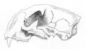 The head is round and shortened (see left), and the teeth are designed for seizing and cutting rather than for grinding -- for example, unlike wolves, who have lower molars for crushing and grinding as well as the carnivore "Carnassial" molars for shearing meat, lions have only the Carnassial lower molars. The tongue is "covered with sharp-pointed, recurved, horny paipillae" (Walker II:1187), suiting it for laceration and retaining food within the mouth. The eyes have pupils that contract vertically.