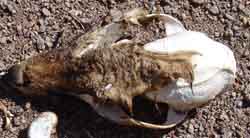 Formerly considered a Sub-order of the Rodents, the Lagomorphs are now seen by some as more closely related to the Even-toed Ungulates (Artiodactyls, see below). They "have three pairs of upper incisors at birth; however, the outer one on each side is soon lost. In adults the smaller second upper incisor is located directly behind the first incisor and lacks a cutting edge." (Walker, vol 1, p.540) (Compare the Rodents, above.) So, while Lagomorphs (or their skulls) viewed from the front "look like" rodents -- one sees 2 very prominent incisors above, 2 below -- this appearance conceals a striking morphological difference in tooth pattern -- 2 upper incisors on each side, a smaller one behind the larger. See below, a cottontail rabbit skull photographed (upside down, missing its mandible) on March 19, 2008 on a high terrace above lower Hot Springs Canyon. Its upper incisors (at far right) show these vestigial, secondary teeth behind the primaries: