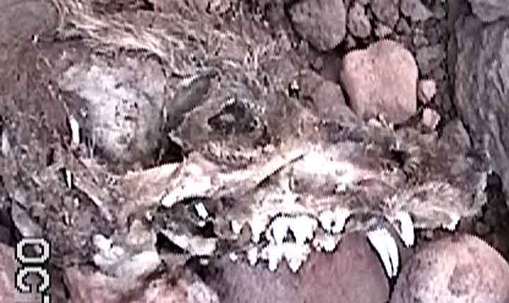 For example, consider at left this partial skull of a Coati found in October 1996 atop Rabbit Ears Saguaro Hill in Lower Hot Springs Canyon, lacking its lower jaw but otherwise complete. (Click on the image to enlarge it.) The eye socket is visible near the center of the photograph, and just below and running behind it is the zygomatic arch, down through which the muscles working the lower jaw would run in life. These muscles have been ripped out (probably by the predator who killed -- or scavenger who feasted upon -- this animal), but the space where they were formerly attached to the skull is evident in the bare spot of skull behind the eye and flanked by remnant patches of hair.