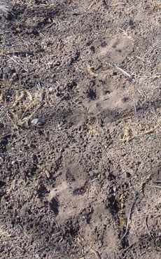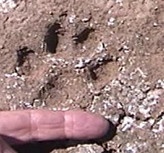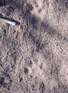 Below, left and center: mountain lion tracks in soft duff and silt, running downstream along an old cow trail near Rabbit Ears Saguaro Hill in Lower Hot Springs Canyon. The tracks are fresh, probably from the previous night, and 3 1/2" across. We followed this track for about a mile along the faint duff-covered trail. At right: a track in the mud of the Diversion Tank. The width of this one is just short of 3".