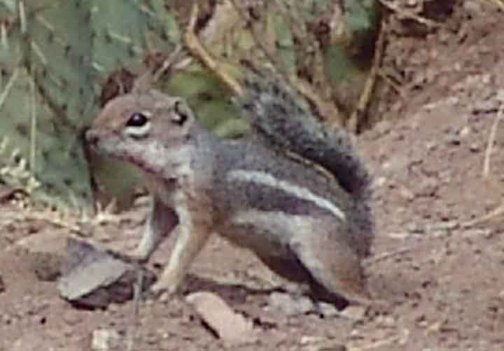 This squirrel is a creature of the arid desert, primarily the Sonoran. Its colors range from "pinkish cinnamon to mouse gray", with a narrow white line on each side of the body. Unlike the chipmunks it somewhat resembles, it has no side-face stripes, though it is nearly as small as they, about 6" long in head and body, 3+" long in the tail, which is completely gray in color. Chipmunks do not appear in our area, according to Burt and Grossenheide, cited in our main Mammal page.