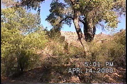 The Upper left quadrant of the photo above shows a small portion of the promontory marking the left-bank bend of the Zig as a whole. This promontory contains the great Cottonwood tree shown with the red arrow in the two comparison photos shown on the previous page (no. 09). Here is another view of this promontory from downstream (in April 2000):