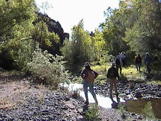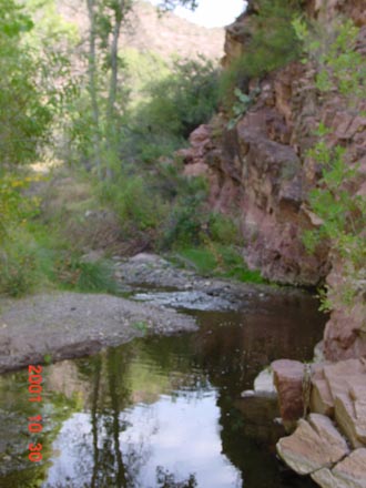 Below, a recent image (October 2001) of the Lower Zig bend up close and as seen from just a few feet downstream. As you can see, the stream runs into a very solid piece of Willow Canyon cliff-face here.