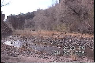 The "Lower Zig" is so-named because the "Zig" of the Zig-Zag Bend (which is clearly visible on our maps -- see Back) actually includes two min-zigs, the lower of which is partly visible in both of these next photos -- on the left below, at far left in lower-mid-photo, on the right below, also in lower-mid-photo but nearer to the center of the picture). In the January 1996 photo, riparian trees are sprouting up (though deciduous, hence less noticeable in the image);by the November 2002 photo, the new trees almost obscure the Narrows.