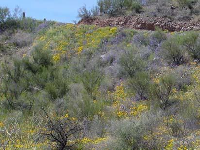 Image at left: flowering hillside in lower Hot Springs Canyon, March 2001.