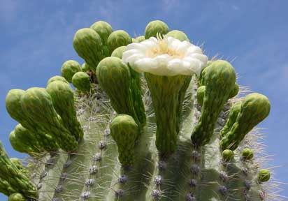 Image at left: Saguaro blossoms emerge in May 2002, lower Hot Springs Canyon