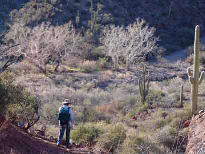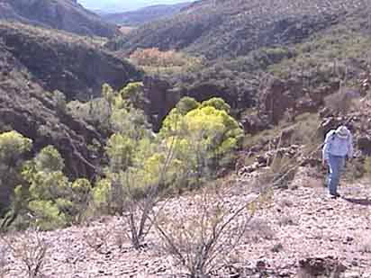 Image at left: Hot Springs Canyon viewed from the Red Trail, February 2004. Sycamore trees showing early signs of life.