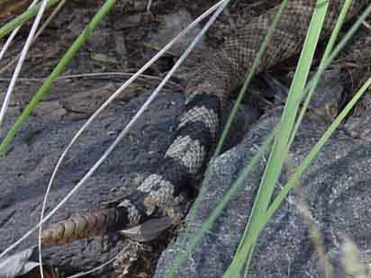 Image at left: tail of retreating Western Diamondback Rattlesnake, Hot Springs Canyon June 2003