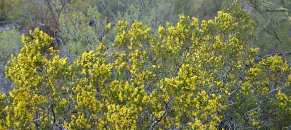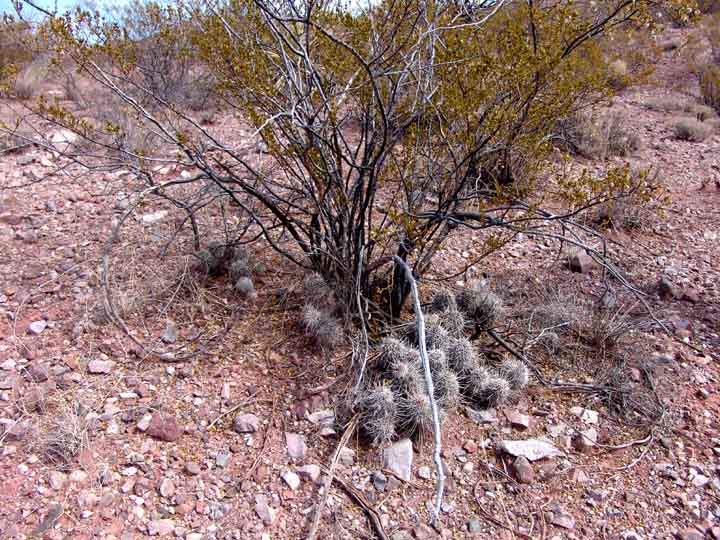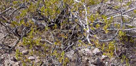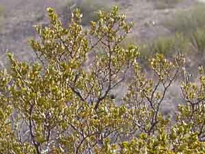 While occurring in otherwise very barren-appearing places, Creosotebush tends to create an enriched, softened soil in its immediate vicinity that creates microhabitats. Thus it serves as an important nurse plant for a number of species, producing a chemical inhibitor of germination that apparently works mainly against its own seeds. At left, it nurses a young saguaro. Click on the image to enlarge it.