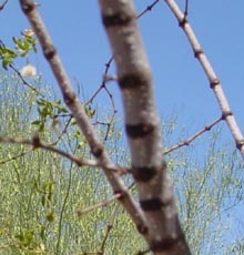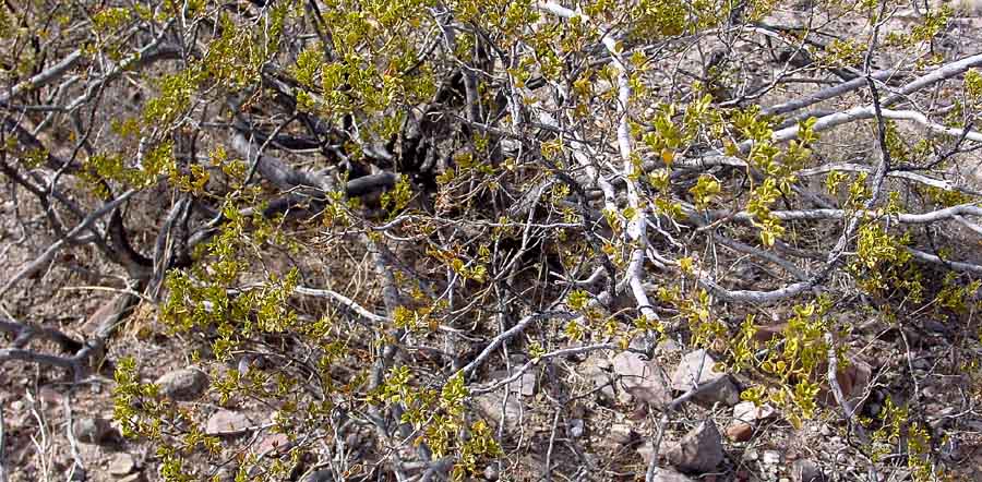 Below left, also taken on the Pool Wash ridge road in May 2002, a view of the typically open structure of the creosote canopy, which provides but very weak shade at midday. Note the typical grayness of the larger branches here also. Below right, a closeup view of the characteristic gray larger branches of creosotebush, often marked with dark cross-bars.