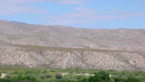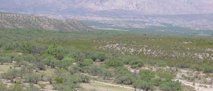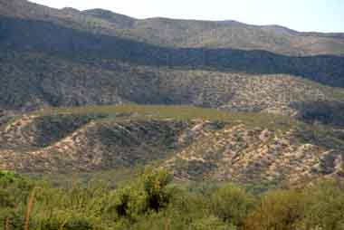 In our area, Creosotebush seems to thrive best on gradually sloping terraces where soils are sandy-gravelly and lack clay horizons near to the surface. Its lateral roots may fan out into more than fifty square yards of surface soil, and it has a fairly deep root system that enables it to tap even meager sources of water from well down, including soils which have caliche layers, which its roots can penetrate through cracks. In such places it can remain active during the entire year, even when shallow soil moisture has disappeared. It does less well on steeper slopes with coarse, shallow soil, where for example Palo Verdes and Saguaro cacti thrive by capturing shallow water immediately during and after rains. Joseph McAuliffe (in Robichaux, cited above, pp. 79-84) suggests that Creosotebush is found mainly on old, stable slopes that have not experienced significant soil aggradation for very long periods of time, whereas different types of vegetation dominate places subject to recent change -- whether aggradation, as in floodplains, where short-lived shrubs predominate, or degradation, as on somewhat unstable gravelly slopes where Saguaros and Palo Verdes are more common. The very high frequency of Creosotebush on surfaces of the remnant Quiburis-period terraces along the San Pedro River definitely supports this view, for example below left, this apparently almost pure stand overlooking the west side of the San Pedro River floodplain photographed from near Mile 16 on the Cascabel Road; below right, a view from further north along the river shows a terrace mesa, now fully isolated from the higher slopes. If you look closely here you can see hints of Ocotillo scattered among the dominant vegetation. (Click on each image to enlarge it.) These are very old surfaces -- eroding mainly at their extreme edges.