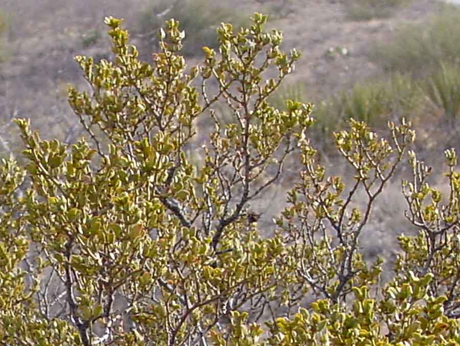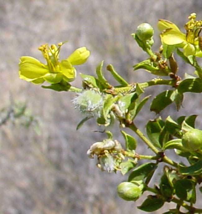 Creosotebush is an evergreen, many-branched, open shrub whose upper elevation limit in our area is about 4,500', and which is found most strikingly on dry plains and mesas, where it sometimes occurs in almost pure stands. It is a dominant or co-dominant member of most plant communities in the Mohave, Sonoran, and Chihuahuan Deserts, being excluded only from North America's northernmost desert (the Great Basin) by that desert's very cold winters (its northernmost limit is where Nevada temperatures drop to 5 degrees F. in winter). The most drought-tolerant perennial plant in North America, it can survive at least 2 years of no rainfall, losing leaves and shedding branches as its last resorts. For discussion of different varieties of creosotebush found in two of these deserts, see this link: Sonoran vs. Chihuahuan creosotebush.