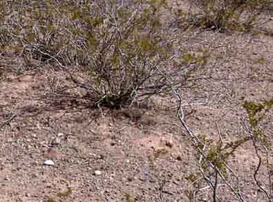 Below left, a creosote bush on the slopes of Soza Mesa photographed in February 2004 provides soft soils which harbor what appears to be a Desert Tortoise burrow. Below right, another Soza Mesa bush both protects small desert grasses (visible near its stems, though dark and shriveled in this February photo) and some rodent occupants whose holes are scattered close by. (click on each image for a seed close-up)