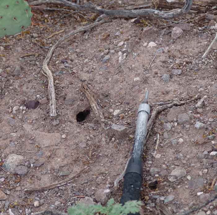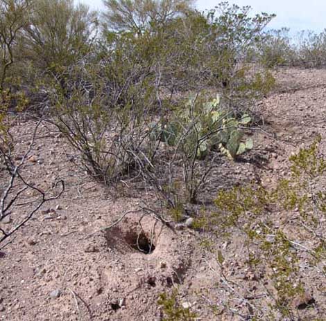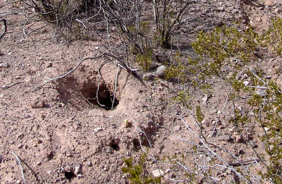 At right, a very small desert hole in one edge of this same mound, signalling the den of perhaps one of our small pocket mice.