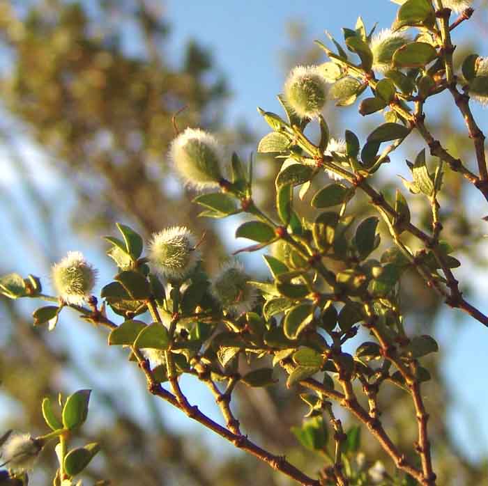 Viewed toward the January 2006 afternoon sun in winter drought, the seed-pods' hairs glow a brilliant white:
