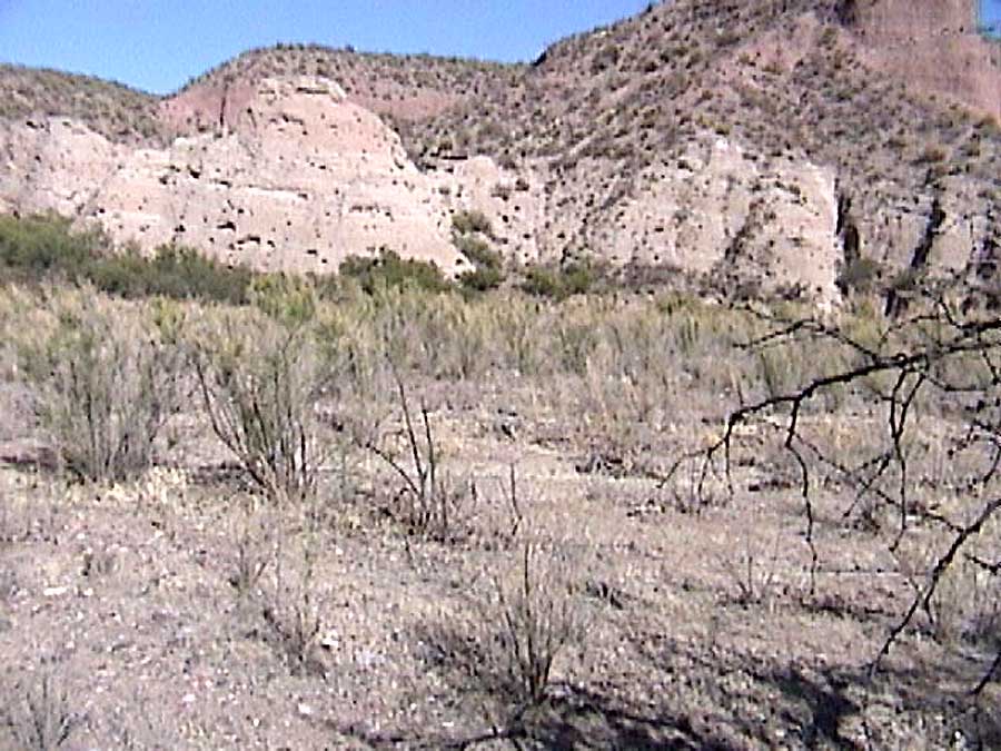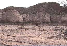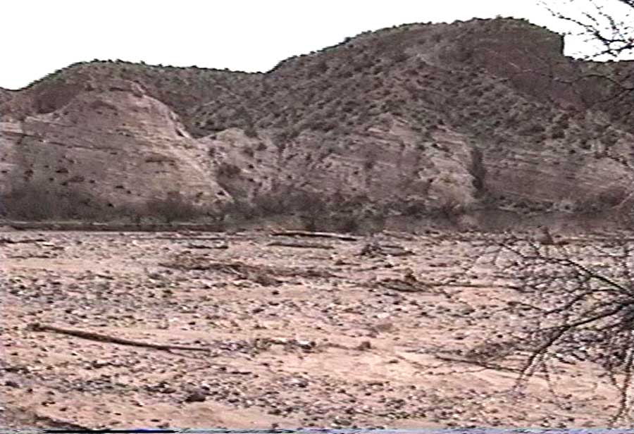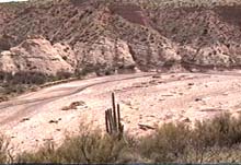 Left: The January 1991 and '93 floods greatly scoured the terraces of Hot Springs Canyon near the Rabbit Ears Saguaro Hill (from which this March 1993 photo was taken -- wash flow direction is from left to right). A new Terrace edge (with mesquites growing on the surface near it) may be seen at low-to-middle at left, marking the limits of the scour. Nearly all vegetation to the right of this has been removed by the flood (with scattered vegetable debris lying on the scoured surface in the right-hand side of the photo -- one large log carried from far upstream may be seen lying in the lower middle part of the photo).