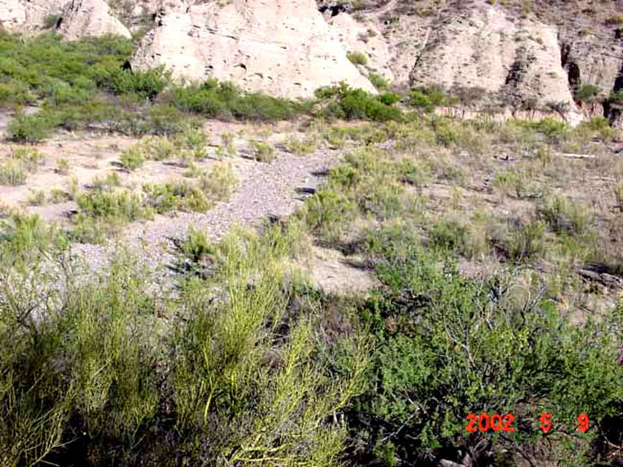 Left: This photo, taken in May 2002 from a position somewhat lower on the hill than the photo above it, shows roughly the same position of the left-bank terrace with its mesquites (though the edge has been greatly softened with time). But the main channel of the wash has become somewhat divided, and is edged by 3 distinct lines of Hymenoclea (predominantly). The new terrace being built up in the middle-right part of the picture is almost entirely vegetated with stands of Hymenoclea.