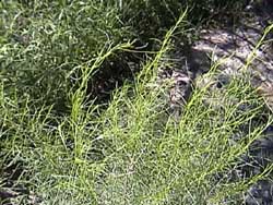 Hymenoclea is a multi-branched, erect or spreading shrub with very narrow, linear leaves. According to Forrest Shreve (cited above, page 71), "The dominant plants of the sandy flood plains throughout the Arizona Uplands are Hymenoclea monogyra and Baccharis sarothroides[Desert Broom], both of which are shrubs of rapid growth and of such habit that partial burial by sand does not interfere with their growth." [emphases provided] In our area, Hymenoclea is most prominent in our largest streamway, Hot Springs Canyon Wash, where periodic flooding over a rather wide floodplain produces frequent and substantial deposits of gravel and sand. Where sand reaches depths of three feet or more, water infiltration is rapid and the quick drying of surface sands retards water loss, enabling these plants to become established quickly after flash floods. Hymenoclea then tends to catch silt in subsequent floodings, contributes to the building of new terraces, and eventually it may form thickets along the margins of the new washes. Under favorable conditions, it may reach 12 feet in height.