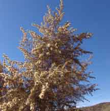 Hymenoclea appears to serve a valuable role in containing flood debris, accumulating silt and other deposits around its bushy base, and channeling the flow of moderate flood waters in such a way as to build up fertile terraces in floodplains. In the cold of winter it takes on a beige appearance, revealing the density of its many vertical shoots as seen below in February 2004: (click on the image for a close-up)
