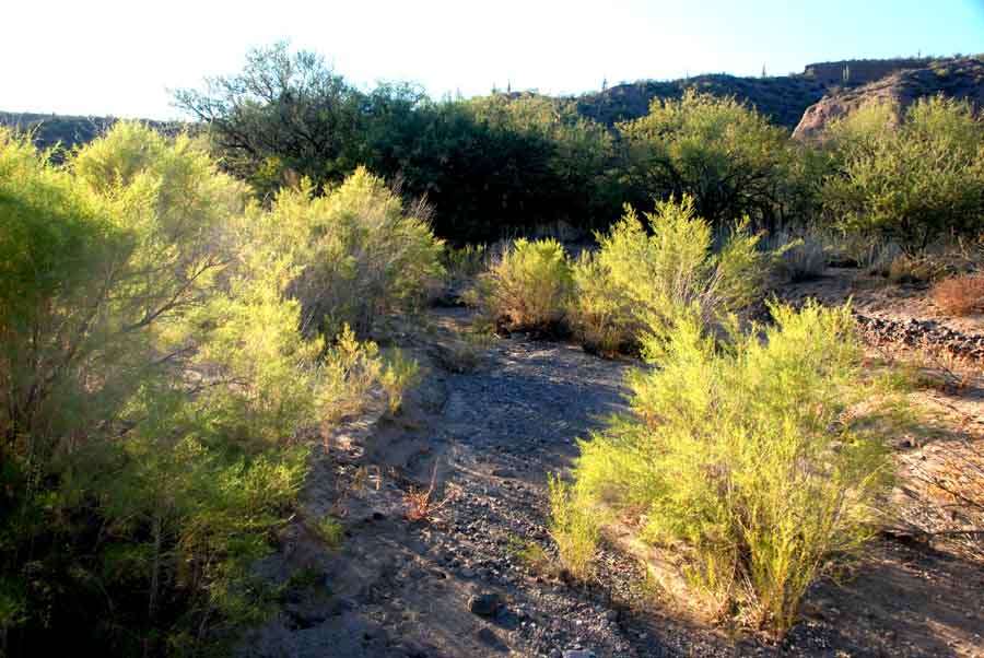 At Left, at the location in the Canyon shown in the photo pair and the top of this page, where the Hymenoclea forms a dense gallery on each side, some of the shrubs standing along the new terrace reach heights of more than 12 feet