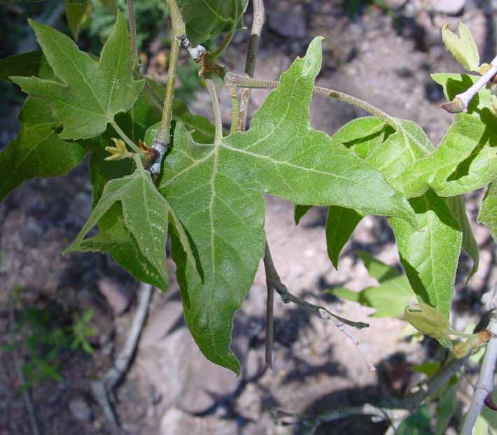 Sycamore leaves are quite large -- 4-10 inches long, nearly hairless, toothless, with 5 to 7 deep lobes (see the photos at left). Leafstalk bases are hollow, with sinuses extending more than halfway to the leaf bases. (Click on the images at left to enlarge them.)