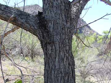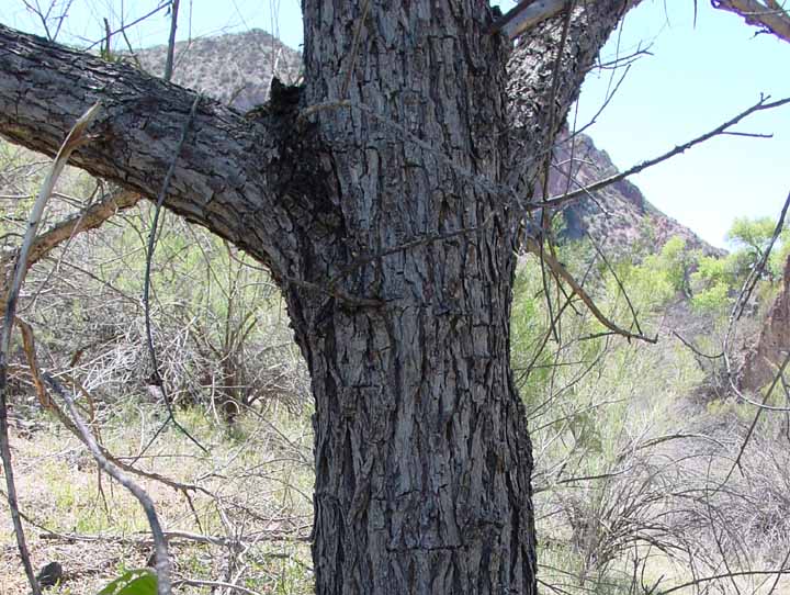 Among the other deciduous, broad-leaved riparian trees with which it is found in our area, the Arizona Walnut (the only walnut species to occur in the desert) is present in low frequency. (Its primary area of distribution is in Mexico.) It may grow to 65 feet and 4 feet in diameter, but the ones in our area are relatively small. It grows rather slowly but is long-lived (up to 400 years old), and has a well-developed taproot. Since its seedlings are susceptible to drought, we find it mainly in wet streambank locations, for example see the banner image in Sierra Blanca Spring. and it is found in Upper Hot Springs Canyon, as you see below: (click on each image to enlarge it)