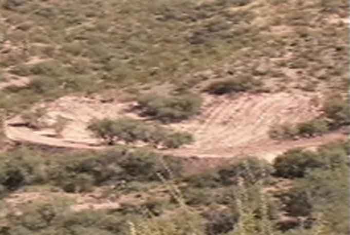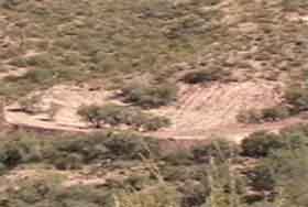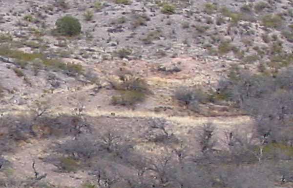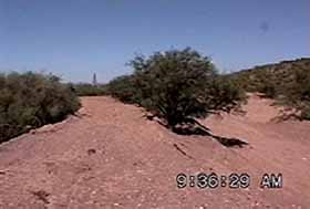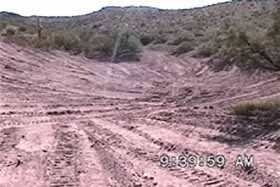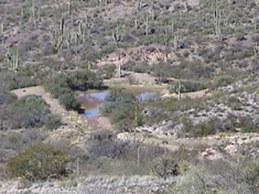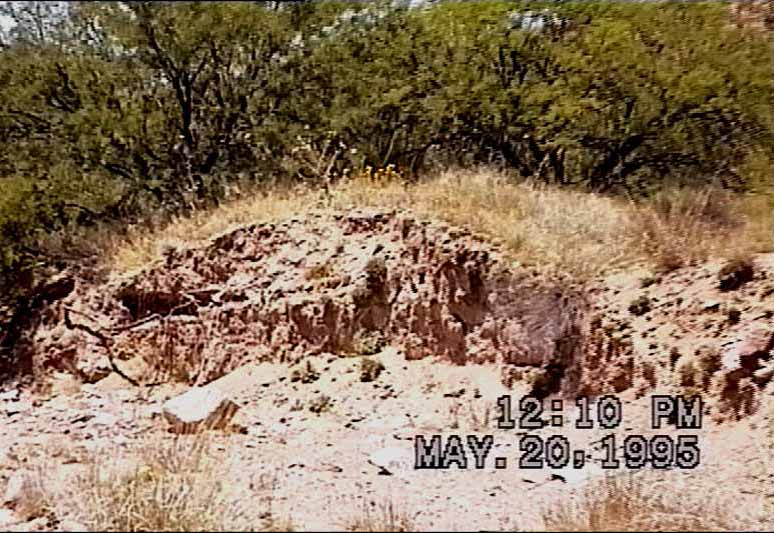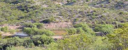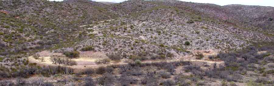 The Secondary Tank was also rebuilt. The panoramic image below (from April 2002) shows the main Diversion Tank at lower left, with its clear bowl shape ringed with dry Bermuda Grass. A horizontal line running from the bowl across the lower center of the image marks the entry channel, while a second bowl may be seen at a somewhat higher elevation at top-center in the lower-righthand quadrant of the image -- this marks the location of the Secondary Tank. Note the contrast in color evident above this Tank -- whitish hills, composed mainly of pale gray, fine-grained Galiuro Volcanics alluvium, which marks the very small drainage serving it. (Click on the image for a closer view of the Secondary Tank.)