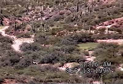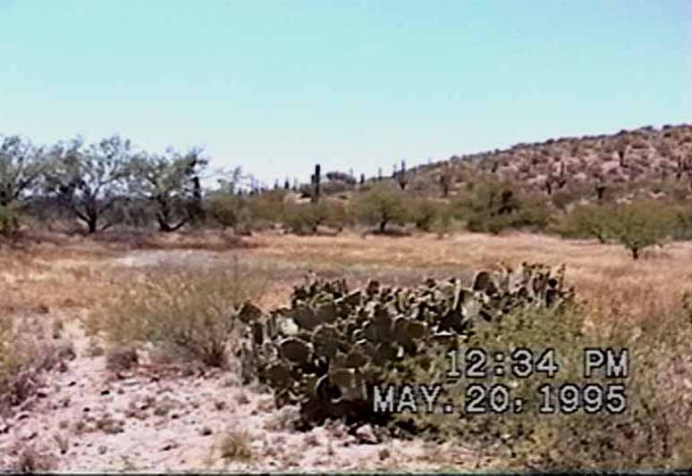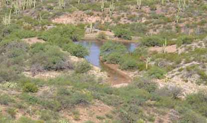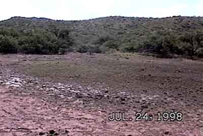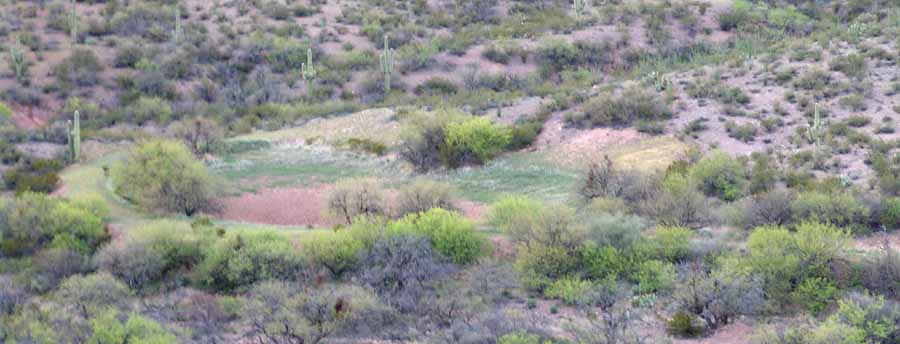 Ranchers in the middle of the past century constructed a long earth berm extending out into the wash, in order to divert its occasional floods into a substantial earthen tank they built there. Eventually this tank filled with silt, which gradually backed up into the wash until the berm was ruptured by flood runoff, and the wash then bypassed the tank. By the time Saguaro Juniper Corporation acquired this land, the Diversion Tank had the appearance of a circular grassy meadow (right-center below), gaining its rain runoff only from its own flanks. Below left, this view from the Pool Wash Ridge Road (elevation point 3815 on the map above), shows the main wash route at lower right and far left, with the enclosing berm lost beneath a wide encircling growth of mesquite trees; below right, a view from upstream in May 1995 looking out toward the encircling embankment with its array of trees. The Tank had become an occasional catchment, displaying the green of fresh Bermuda Grass after rains. (Click on each image to enlarge it.)